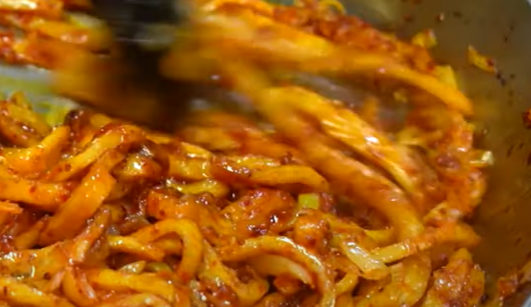 4. 볶아놓은 양념에 채 썰어 놓은 어묵을 넣고 볶아줍니다.