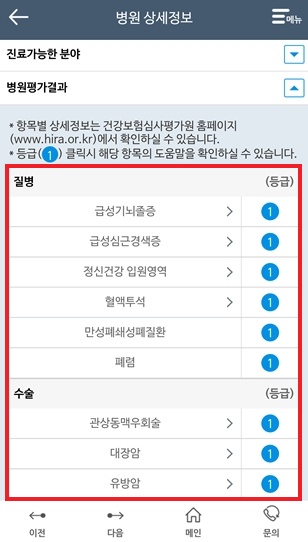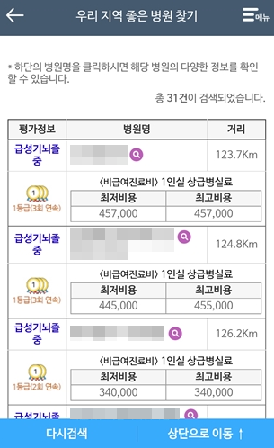 4. 아래와 같이 거리 순으로 병원비와 등급이 나옵니다.