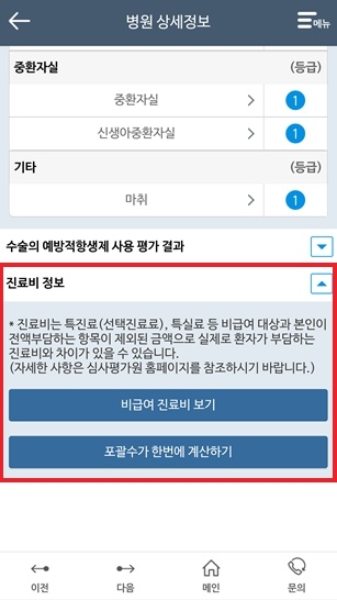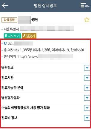 5. 검색된 병원의 이름을 클릭하면 해당의 병원전화번호, 총 의사 수, 병원정보, 진료시간, 병원평가, 진료비 등을 알 수 있습니다.