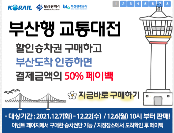 부산역, 구포역으로 도착하는 KTX 열차를 예매한 뒤 인증할 경우 50%를 결제수단으로 페이백해드립니다. (결제 수단에 따라 3~7일 소요됨)