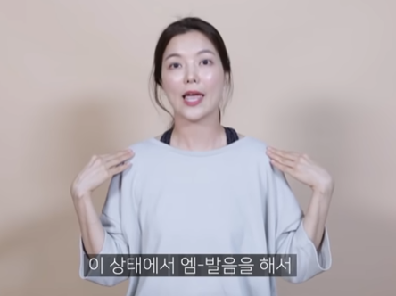 상반신이 보이는 거울에서 배에 힘을 주고 허리를 펴고 어깨를 내려준다. 그 상태에서 치아와 치아 사이가 떨어지게 입모양을 해주고 입술도 힘을 빼고 자연스럽게 벌려준다.
